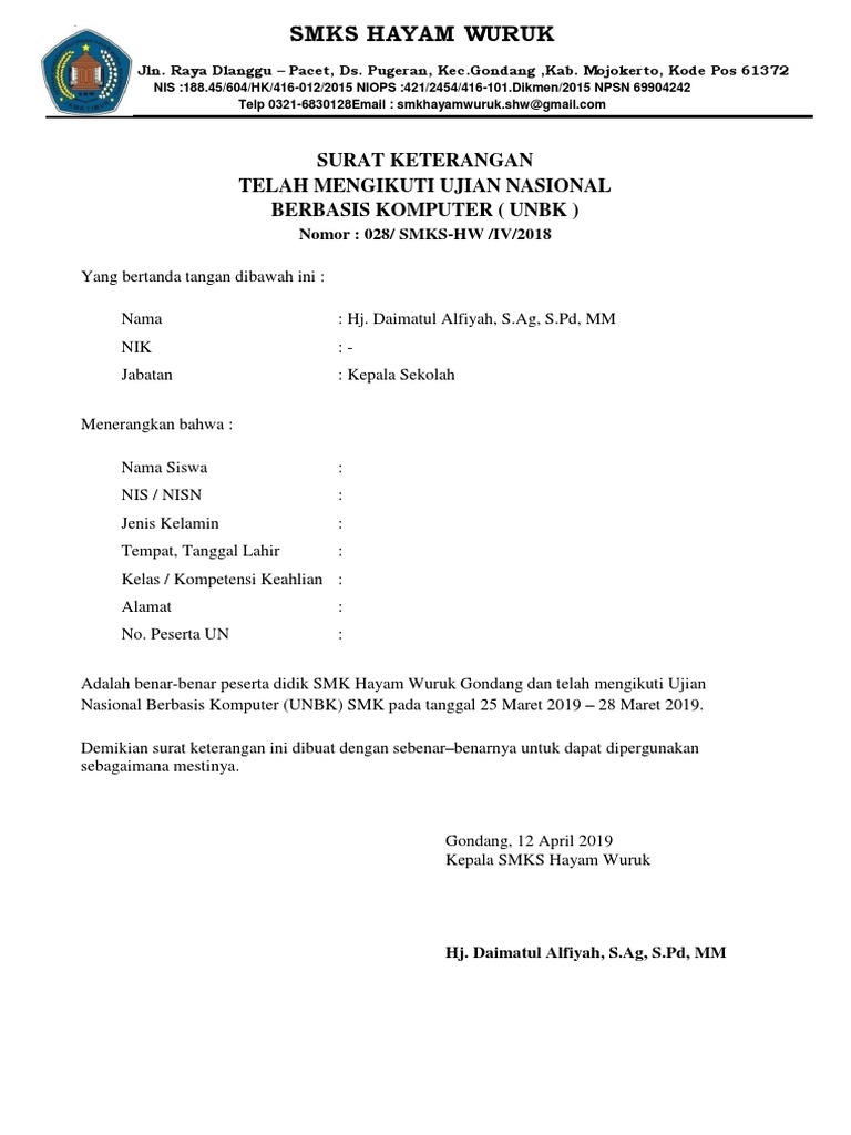 Source: Surat Keterangan Mengikuti Unbk Pdf